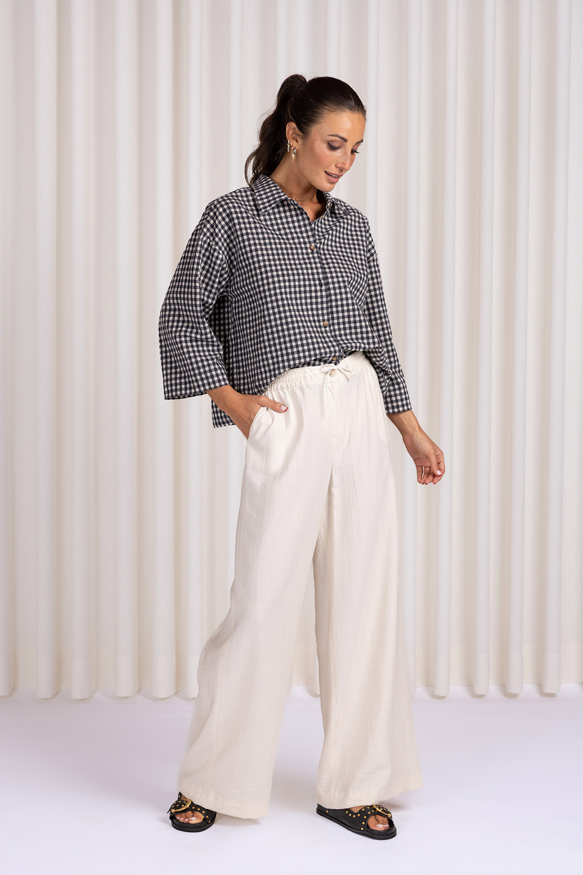 Een casual pantalon met een professionele uitstraling. De taille heeft rondom rek, maar blijft vooraan strak om het effect van een klassieke sluiting te behouden. Met schuine steekzakken, gebiesde achterzakken en een wijdere, gestroomlijnde pasvorm werkt hij zowel met een sweater als met blazer.
