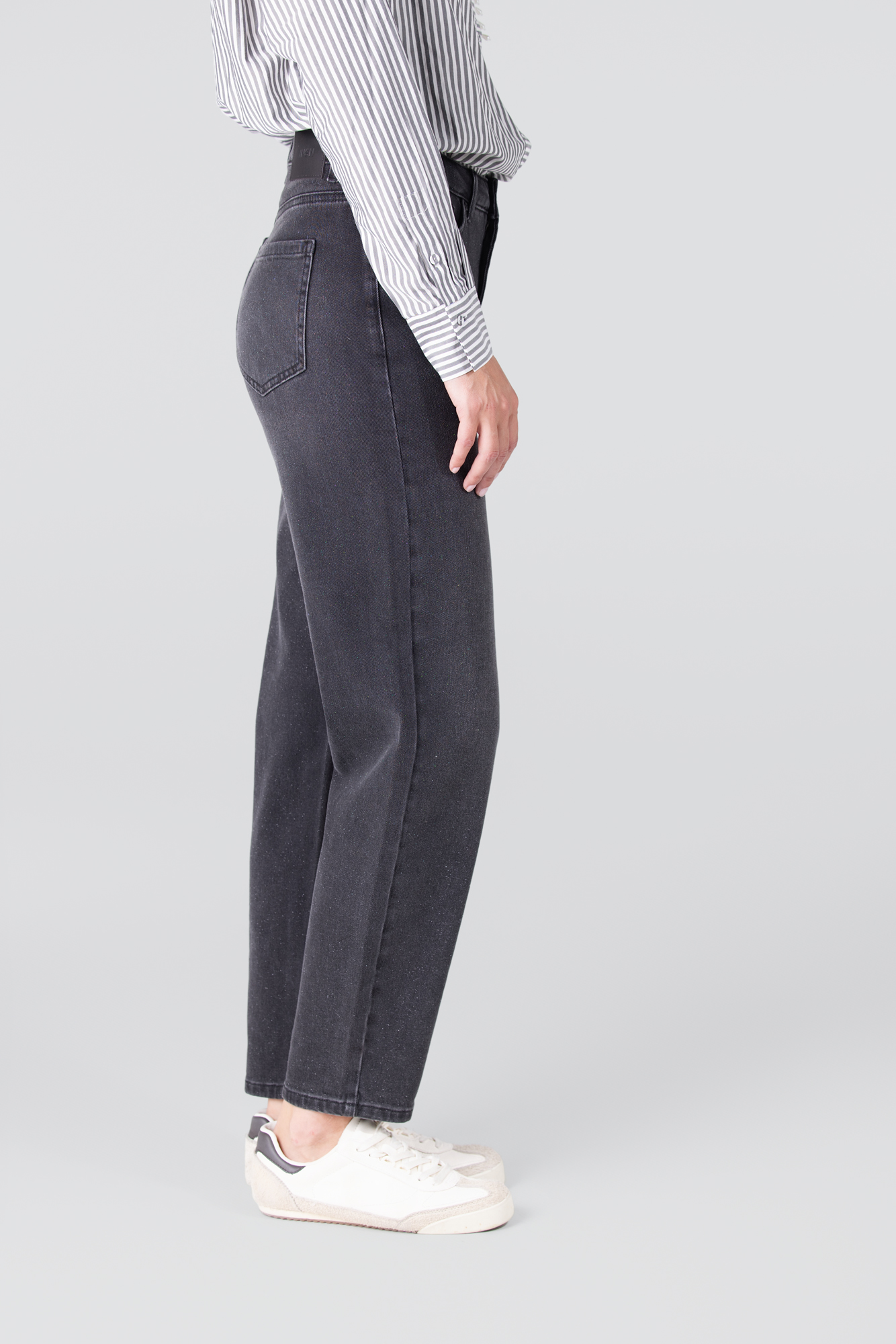 De Emma jeans is een perfecte mix van casual comfort en subtiele glamour. Deze straight leg jeans in antracietkleur is afgewerkt met een glitter spray, die een speelse, sprankelende touch toevoegt zonder te overdrijven. Het klassieke 5-pocketmodel zorgt voor een tijdloze pasvorm en praktische functionaliteit. Ideaal voor wie houdt van een stoere look met een vrouwelijke twist.