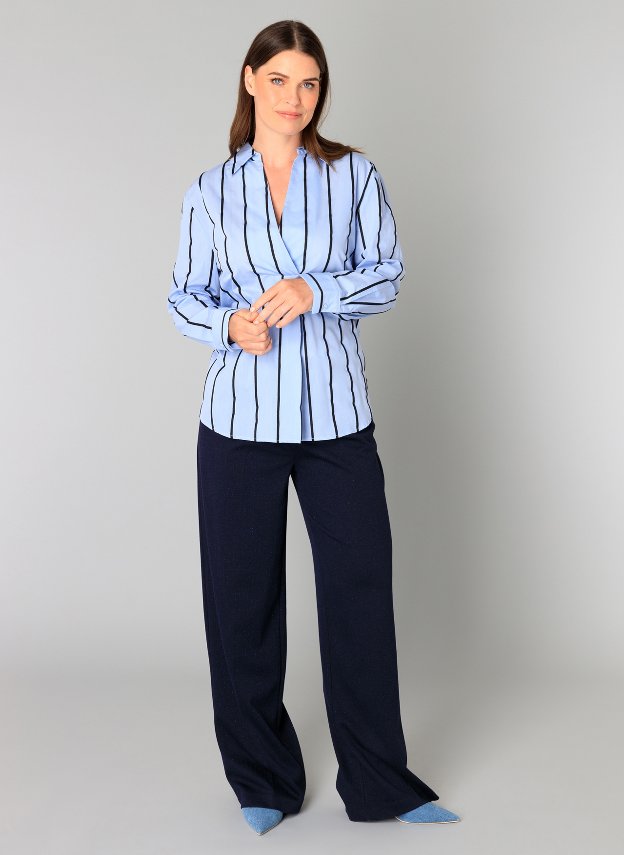 Deze blouse met verticale strepen is gemaakt van een zachte katoen-nylon mix die zorgt voor een fijne pasvorm en duurzaam draagcomfort. Het overslagmodel met kraag geeft een frisse, moderne twist aan een klassiek design, ideaal om zowel casual als wat netter te dragen.