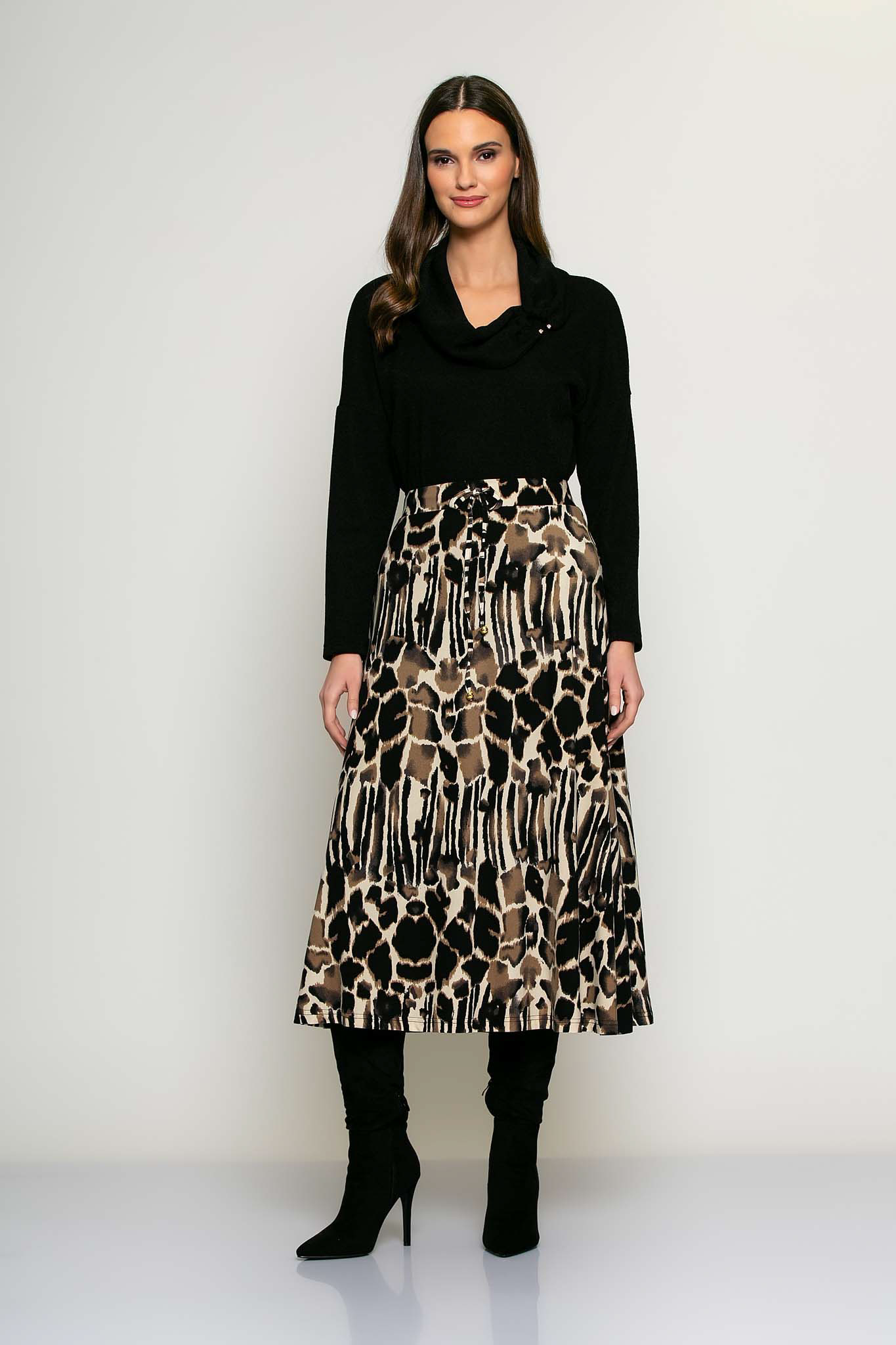 Gevoerde rok met A-lijn model en een opvallende beige-zwarte print. De rok valt tot aan de kuit en heeft een elastische tailleband voor een comfortabele pasvorm.