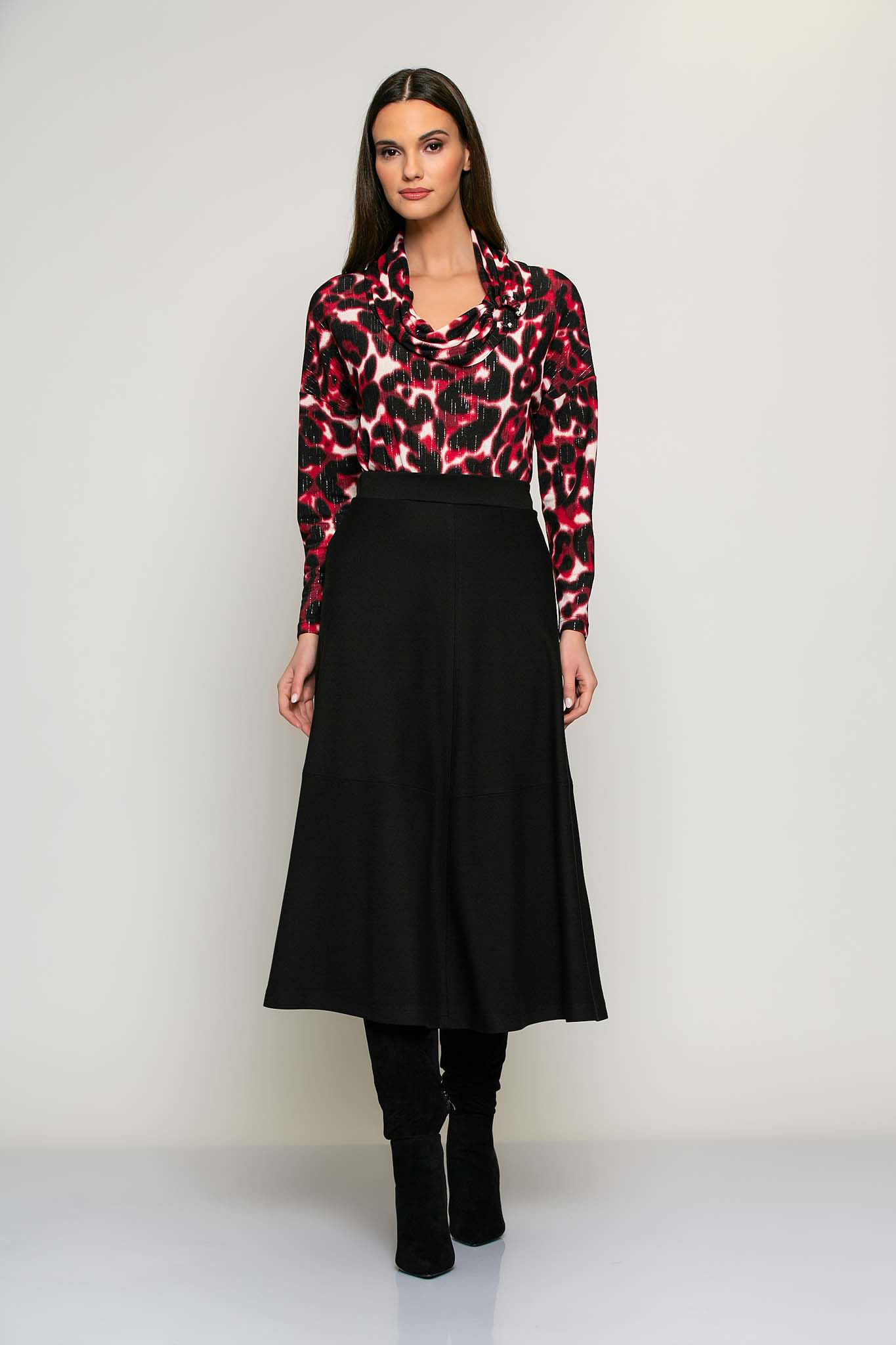 Shirt met lange mouwen, rood-zwarte print en glitterdraad in de stof. De hangkraag geeft dit shirt een elegante, iets losvallende uitstraling.