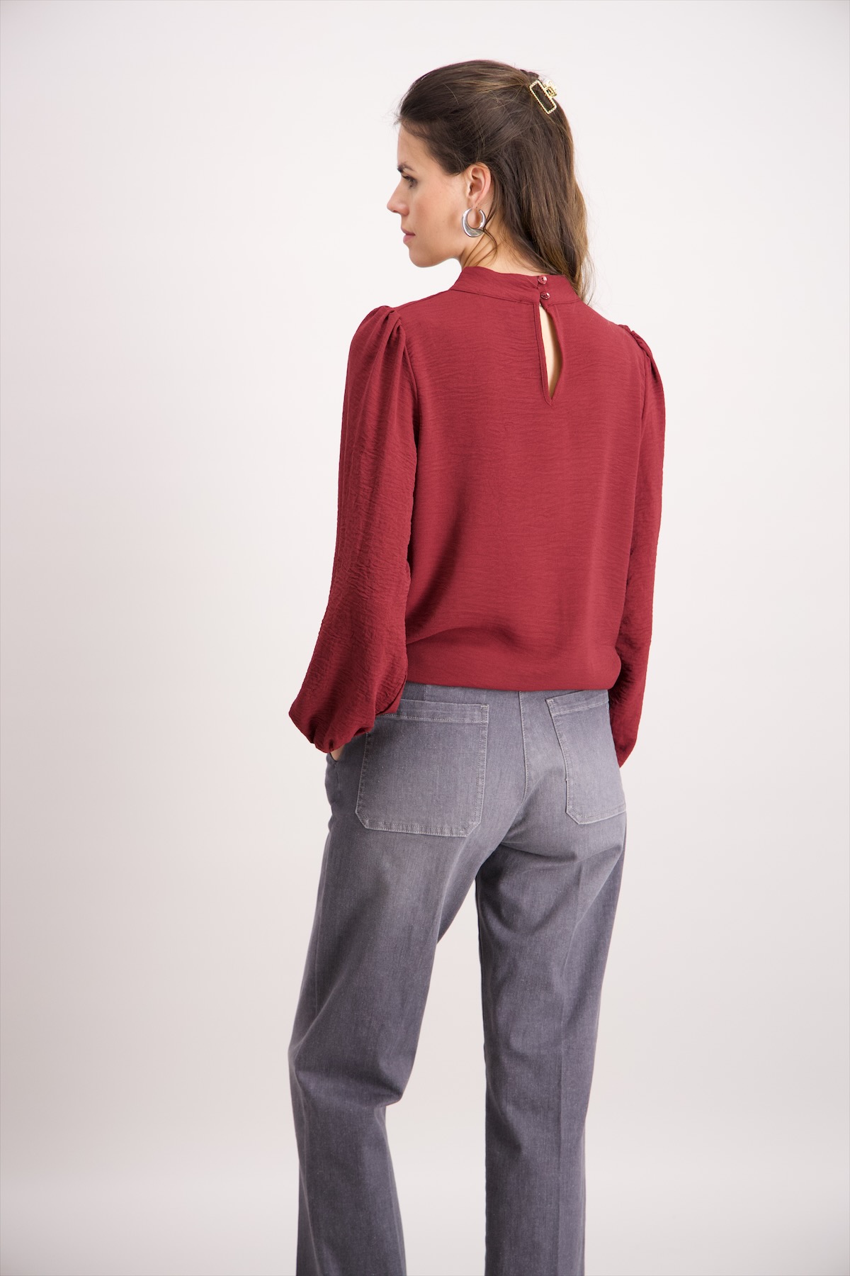 Stijlvol shirt met opstaand kraagje en lange mouwen met elastiek aan de uiteinden. De knoopsluiting achteraan in de hals zorgt voor een verfijnde afwerking.