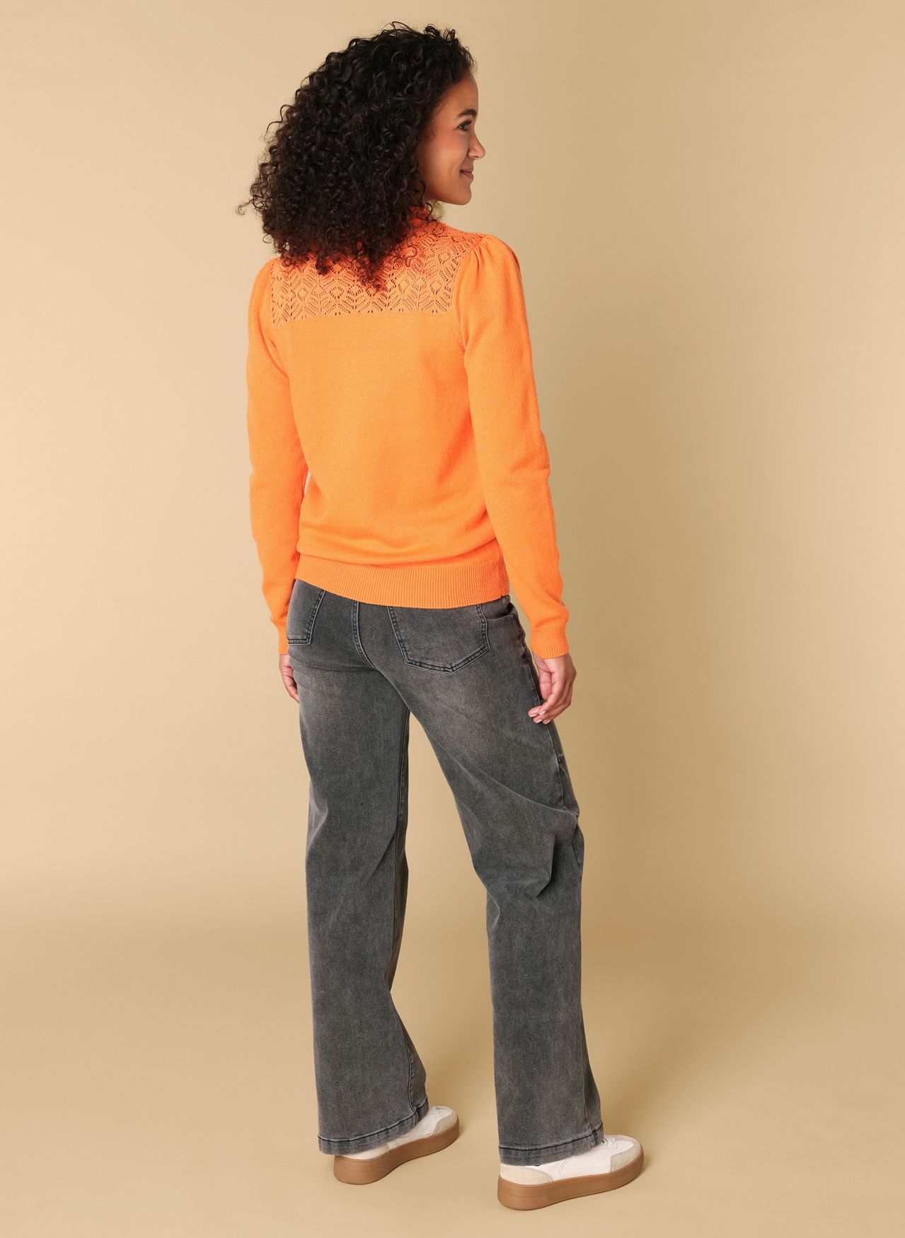 Zacht als een wolkje, met een romantisch randje. Deze trui is gemaakt van een soepele viscoseblend en heeft een vrouwelijke turtle hals met een verfijnd kanten inzetstuk. Verkrijgbaar in de kleur Mandarine Orange, een kleur die je look direct zachter maakt.