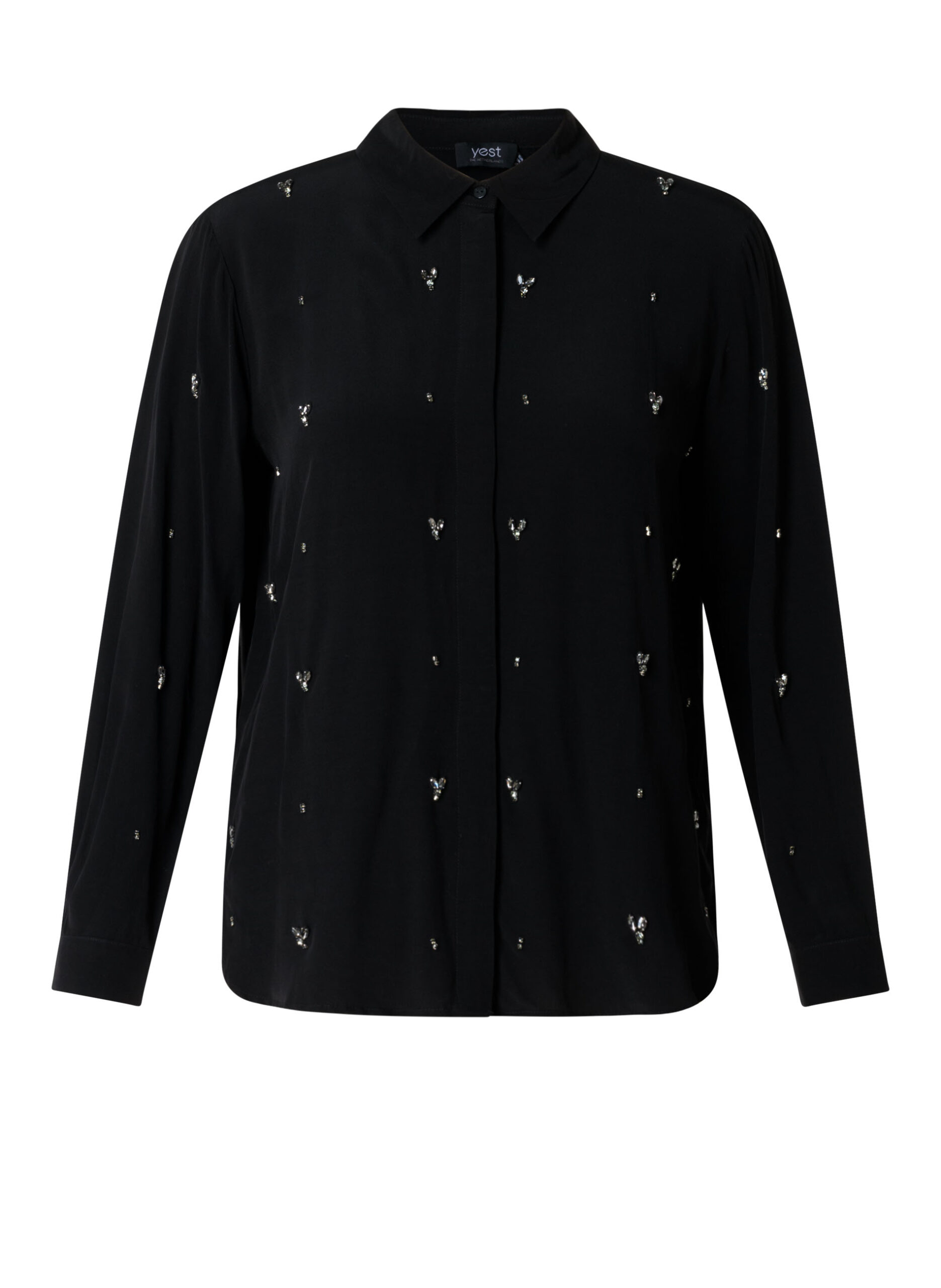 Dit is echt zo’n blouse waarmee je meteen iets extra’s uitstraalt. De zwarte viscose valt soepel en voelt heerlijk zacht, en die fonkelende strass steentjes maken hem helemaal bijzonder. Of je hem nu op een jeans draagt of wat netter combineert: hij tilt je outfit direct op.